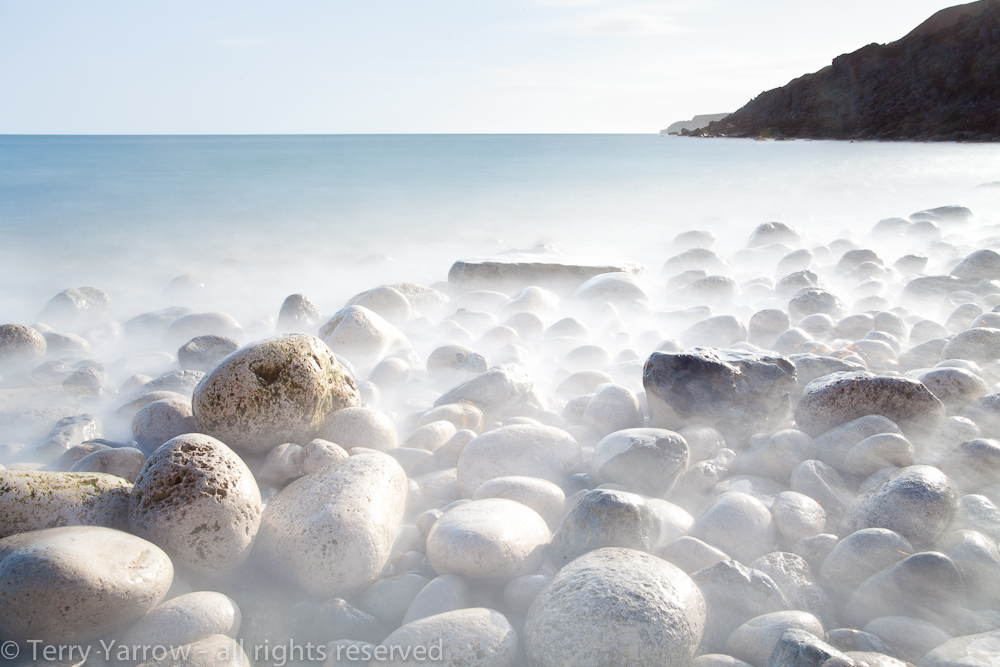One of my favourite places in Dorset when I am walking is Church Ope Cove on Portland. It is one of those places that has a real air of mystery about it, almost as if there is something sinister in its past and it is partly because of the somewhat quirky things around it. The picture below was taken on a walk last week and was an attempt to capture something of the mystery of the place but in reality it needs a more dark mood really to do it ‘justice’. It is a long exposure shot creating a misty blur as the waves roll over the pebbles and stones.