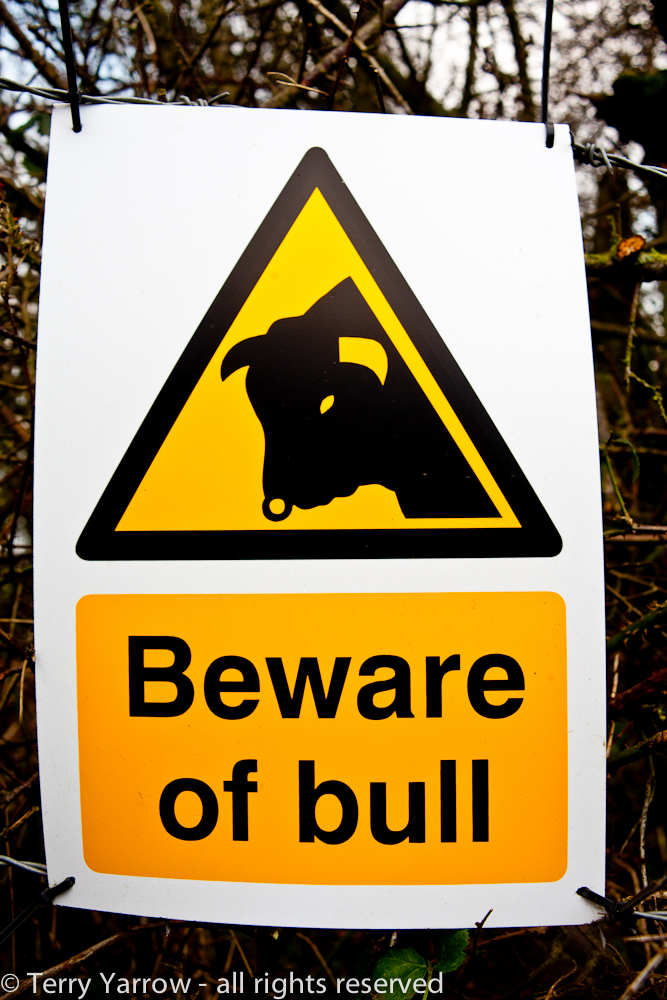 Whilst on the subject of bovines – notices like the one above pose questions in my mind when there is a public footpath running through the field.  Questions like ‘Are they allowed to put a bull in a field with a public right of way running through it?  Well they are……..provided, 1) It is under 10 months old, OR 2) It is not a dairy breed such as Ayrshire, British Friesian, British Holstein, Dairy Shorthorn, Guernsey, Jersey or Kerry, AND 3) It is accompanied by cows or heifers.  Technically the sign above is illegal because the word ‘beware’ implies that the bull is dangerous which can be seen as intimidating walkers.  Also, the recommendation is that the sign should only be put up when a bull is actually present.