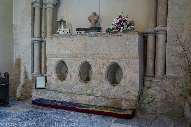 One of the interesting things about this church is the tomb below.  It has three oval openings at the bottom and it is said that people used to put their hands or legs in those alcoves in order to be healed.  This is one of only two shrines in England that have survived intact after the Reformation!