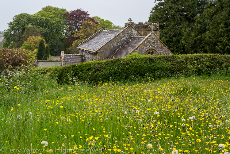 Having climbed up to the top of the valley, I crossed the ridge and dropped down the other side again, just as the rain came on!  And I came across another delightful hamlet nestling in the valley with its little church sitting on its own in a meadow of dandelions and buttercups.  It always enriches a walk when you come across these little unexpected treasures, and this was certainly a treasure with its rather unusual tower looking as if it was an afterthought!