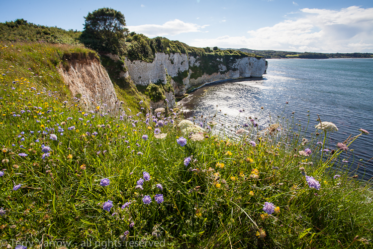 The next stage of my walk took me away from the beach and up onto the clifftops….and to an altogether more agile flier than the cumbersome troop carrying plane.  Walking along the beautiful grass covered cliff top, I decided to rest and just enjoy the scene.  I sat on the grass and watched hundreds of martin’s wheeling through the air with amazing skill.  In fact I tried to watch them through the binoculars but they were just so fast, constantly changing direction, that I couldn’t follow them.  I guess they were making the most of the sunshine and having their dinner on the wing, swerving here and there to catch insects in flight.  It was a wonderful sight!  And the wild flowers were amazing too, almost as if someone had planted them – but then, I guess the great gardener himself did just that :)!