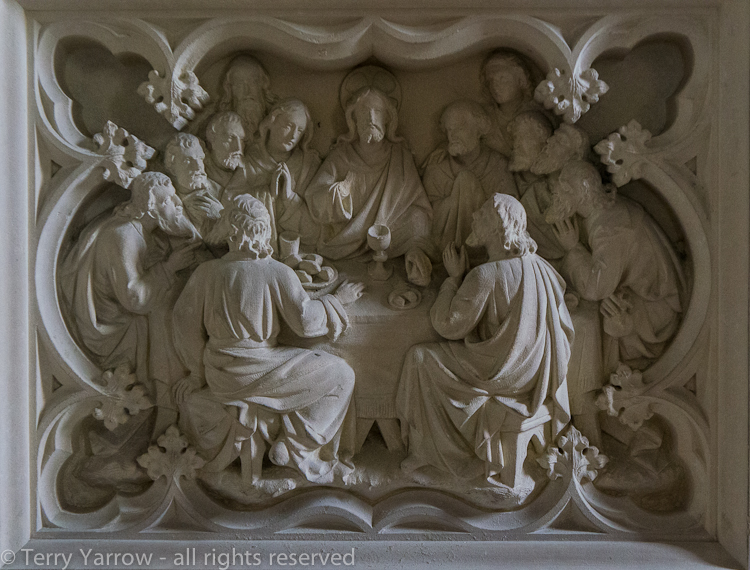 What makes this such a lovely place is that the church is surrounded by fields and has no road access – tradition has it that there was originally a settlement immediately surrounding the church but that it was decimated by the Black Death, leaving the church isolated. The church was restored in 1881 so many of its features are late victorian, such as the beautiful carving on the altar pictured below.
