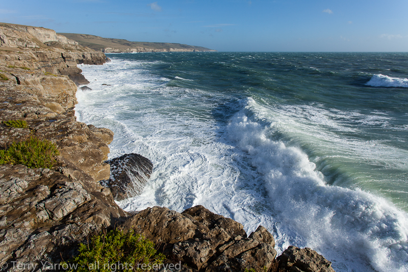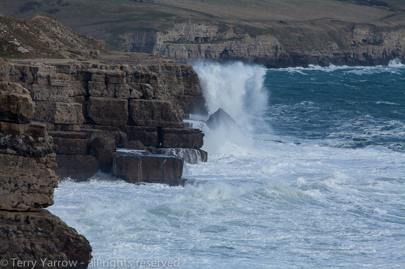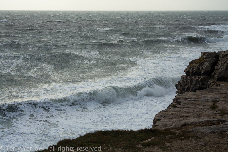 Conditions for photography were dire because the spray coming up from the rocks below was enormous – in fact it may as well have been raining!  Cameras and salt sea spray do not make a good mix so the only way to get pictures was to hold the camera landward of my body to protect it, and then very quickly bring it up, grab the picture and then tuck it away again.  There was no time to properly compose the shots.