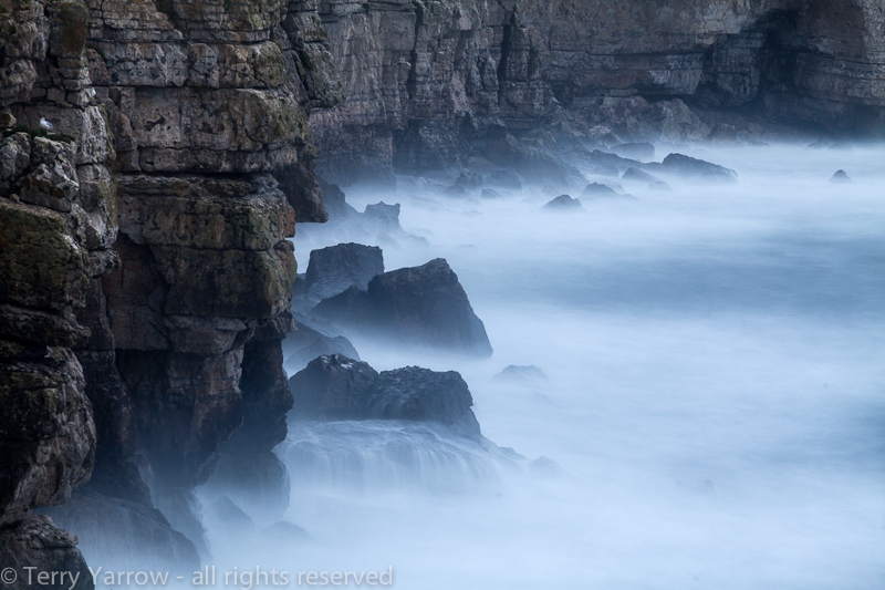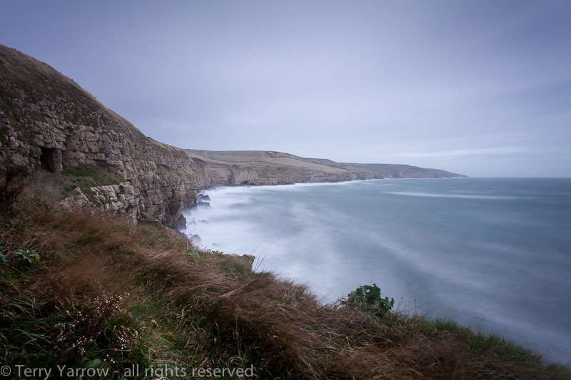 Along this part of the coast, there are many old quarry caves so I decided to take refuge in one of those and to see if I could at least find some way of getting out of the constant spray so that I could try to get some better pictures.  I was carrying my tripod so I set this up in the entrance to one of the caves and stood between it and the sea so that I could protect it from the spray.  I was then able to get some long exposure shots in an attempt to convey the true power of the sea.