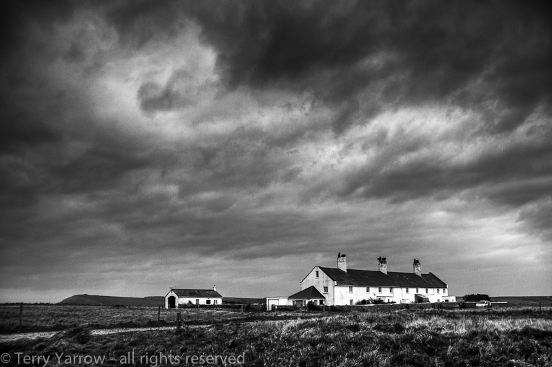 As I turned away from the coast to start my walk inland, I passed the row of old coastguard cottages that stand proud on the headland.  These once housed the officer and men with their families but are now in private ownership, mostly as holiday accommodation – and what a great place to stay!  With the heavy storm clouds above, I couldn’t resist taking one more picture.  It was an interesting experiment in how to hold a camera steady in the failing light with a Force 9 gale blowing!!  I could have used the tripod but that wouldn’t have stood a chance – well just ‘wouldn’t have stood’!!  As it was, I just crouched as low as possible and anchored myself as best I could.