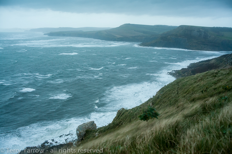 My intention was to climb from here up over St Aldhelm’s Head so I repacked my rucksack and left the safe confines of the cave and walked out again into the teeth of the storm.  The route initially took me along the rocky ledge but all too soon I had to leave that solid ground and venture onto the very muddy footpath that climbs steadily upwards towards the top of the headland some 350 feet above the sea.  Any of my local readers will know that this mud is SLIPPERY and CLINGY so that your feet become heavier and heavier as you walk.  With the combination of the ever steepening path, the slippery mud, the sea spray, and the howling gale that was gusting powerfully off the sea, this was one challenging walk………and it was GREAT :)!!  The expression ‘blow the cobwebs away’ comes to mind.  It was only later that I learned just how strong the wind was!