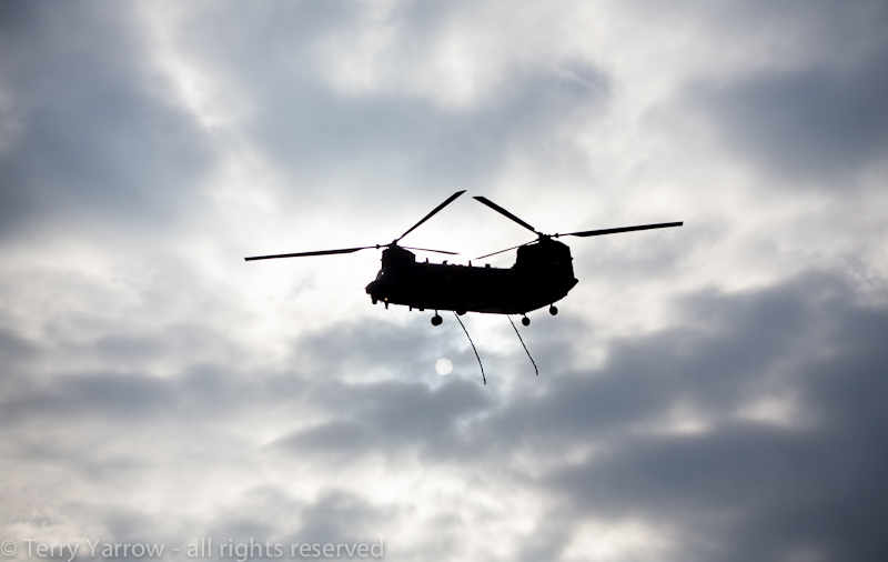 With a thunderous roar, like a giant bird coming out of the sun, the Chinook appears…..and it will accompany us for some time. This is a military machine on manoevers, landing on the headland and hovering over the water by turns, depositing and picking up troops on a training exercise. With precision timing, it is another, if different, spectacle to behold. As much as I love the solitude and silence of the countryside, these helicopters make an awesome sight with their massive power and yet incredible manoeuvrability – to quote Cassius Clay, they ‘float like a butterfly and sting like a bee’!