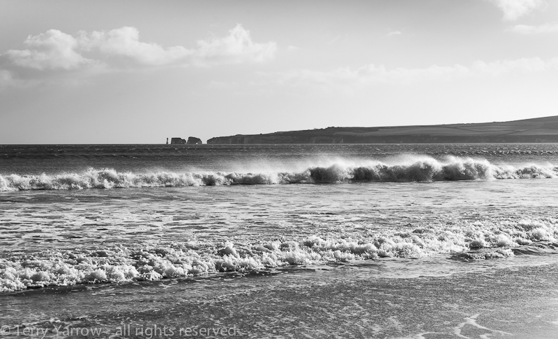 On this day the wind was strong and the waves rolled relentlessly to the shore, one after the other without losing any momentum. As one finally dissipates its energy onto the beach, another three pile in behind it, like some perpetual motion machine. Standing on the shore, you get some sense of what King Canute must have felt! And that great Iona song, ‘Wave After Wave’ comes to mind.