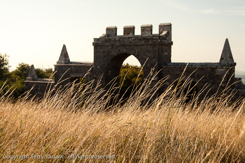 I was nearing the end of the walk now and the evening sun was setting, creating a beautiful warm glow across the hilltop and picking out the long grass which seemed to be aflame. The evening was very still and balmy as I passed the castellated arch which stands on the ridge above yet another old Purbeck mansion. The house itself sits in the valley below and the arch is in fact nothing more that a folly that can be seen from the house but it always adds a little bit of mystery in the fading light. I sat a while and just drank in the scene, and some water too before heading back to the car.