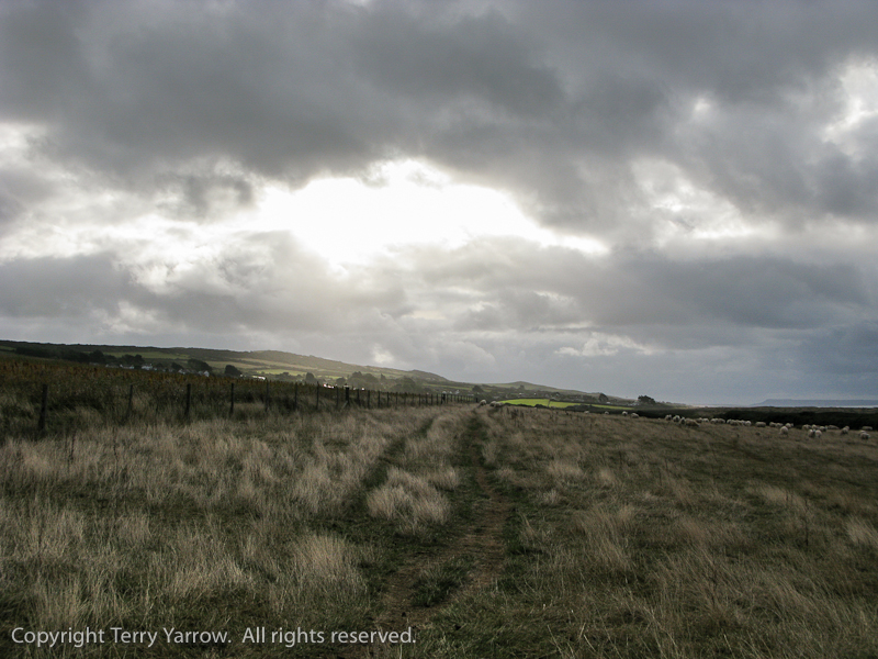 The early part of the walk took me back through the village of Puncknowle and back up onto the ridge I came along yesterday.  After a short time on the ridge, I dropped down the other side to rejoin the coast path at the end of Chesil Beach where I turned west.  After a short time I turned around to look back at the beautiful sunlight catching the hills I had just walked over, but there were already ominous signs in the dark clouds gathering above!