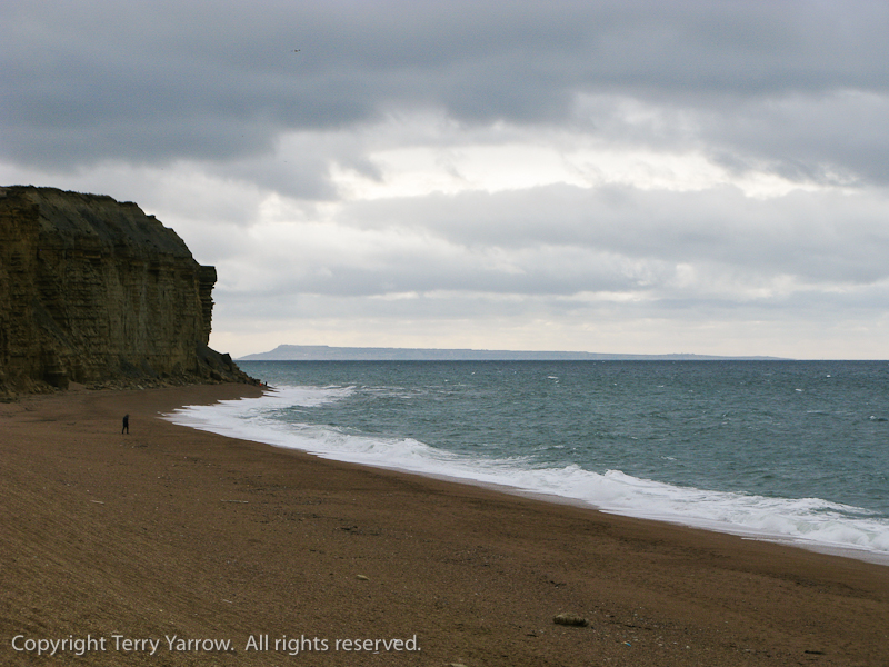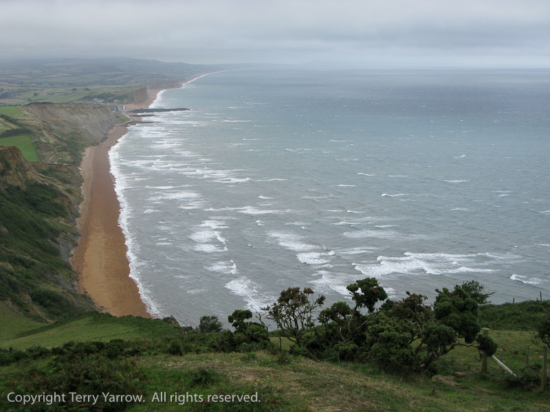 Climbing back up to the top of the headland, I turned for a last look at the town to see the wind really whipping up the waves along the shore.  It was becoming increasing difficult to walk against the ever strengthening westerly wind!  I continued along to the next bay, Eype Mouth, another Broadchurch location with the little cabin part way up the cliff path.  Even on the leeward side of the hills there was little protection from the wind which was like an enemy trying to beat me back.
