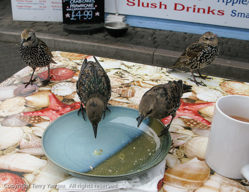 At 10.30am I walked into West Bay where I intended to stop for breakfast as I knew there would be kiosks selling bacon and egg baps – mind you, I hadn’t anticipated having to share it with a hundred starving starlings ;)!  They were so tame that they were eating off my plate and out of my hands.  The two girls sat at the next table thought it was really funny.  Just to continue the TV theme, I noticed that the kiosk also sold Broadchurch Burgers, a smart marketing move :)!