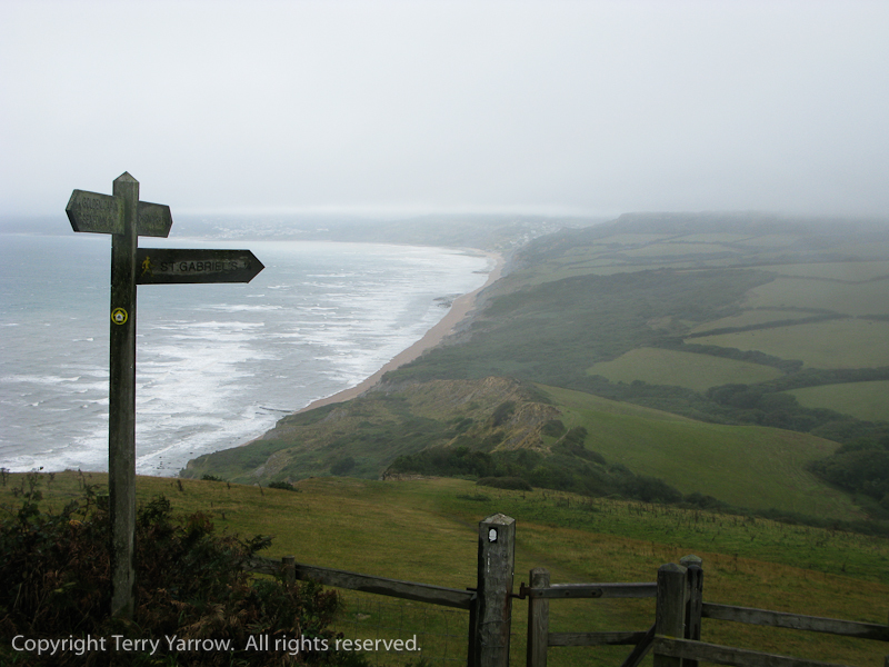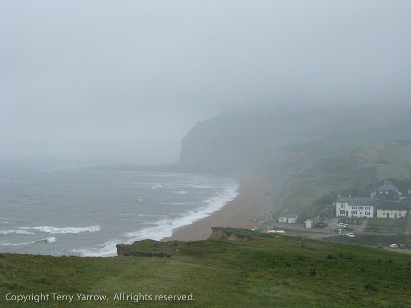 Only when I was half way down did I drop out of the mist and low cloud and could see the way before me.  I wiped the rain from the camera lens for the hundredth time before trying to grab another picture.  Three miles to go to reach Charmouth where I hoped I would find a tea rooms to dry out and perhaps ride out the storm.  I pressed on with yet more ups and downs, yet more wind, yet more dense mist, yet more teeming rain in my face!  The final climb before Charmouth, whilst definitely not the highest, always seems the hardest, probably a case of ‘so near and yet so far’!  But eventually I made it!