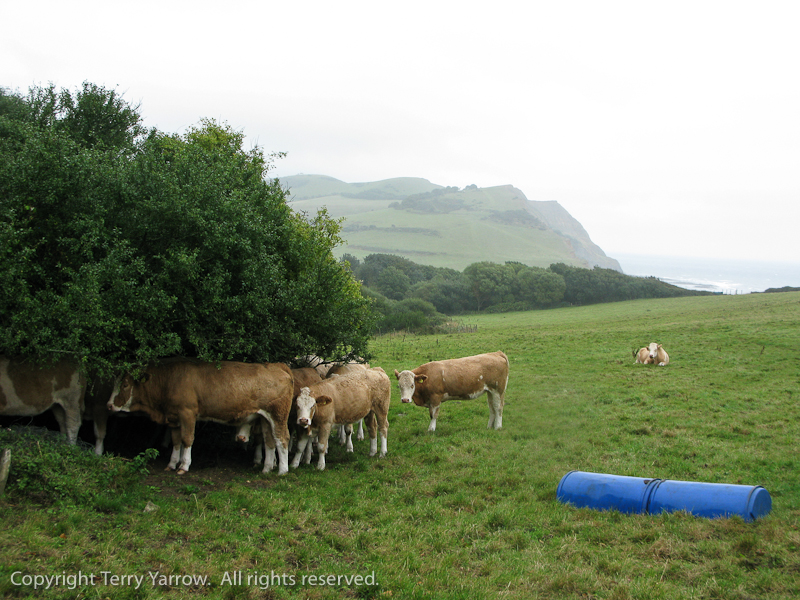 Starting my climb upwards from Seatown I passed a couple walking in the other direction with the wind on their backs, ‘Its clearing from the west’ they said.  It didn’t!  Well not for some time anyway.  Shortly afterwards I passed the cows in the picture below – even they were trying to find refuge from the severe conditions, trying to shelter under what flimsy trees there were.