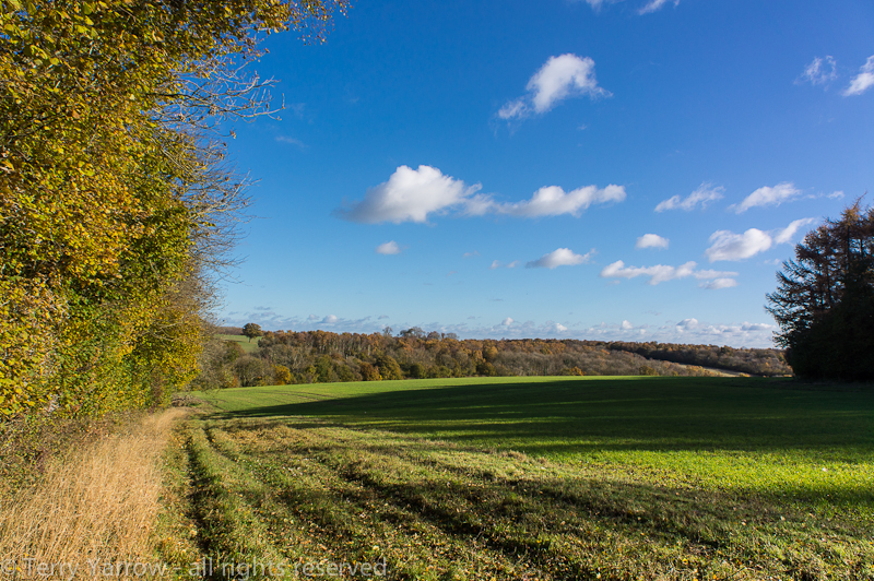 At the end of the woodlands, I stepped out into beautiful open countryside and the low autumn sun threw long shadows that seemed to be reaching out to greet me as I walked, as if wanting to shake my hand.  At this point it was fast approaching lunch time which at this time of the year always poses a problem!  In the dryness of summer, all that is needed is a patch of grass but in the ‘wet’ season, more is needed.  I searched for a suitable log as the ground was far too wet and it made me think that land owners could be more considerate of walkers when paths cross their acreage.  Just a log left here and there is all that is needed!  I found one and sat to eat :)!