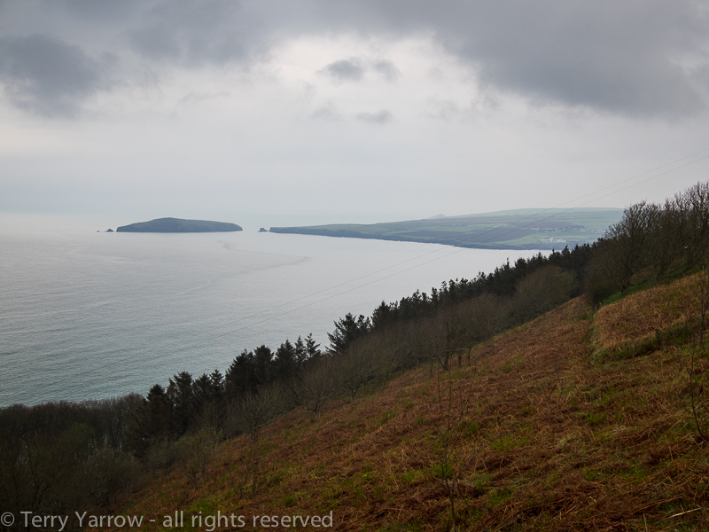 Cardigan Bay and Cardigan Island from Cemaes Head on a wet evening