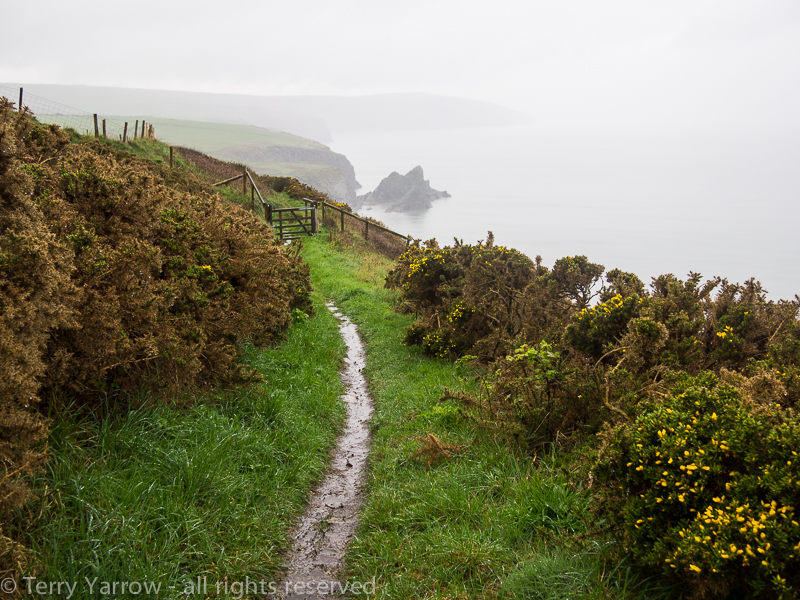Very early in the day I climbed up and over Pen Yr Afr, the highest point of the whole walk at over 575 feet, with its amazing folded strata.  The day quickly became a bit of a slog and I just put my head down and kept walking, trying as best I could to keep the stinging rain off my face.  Taking photographs was difficult as the camera got soaked every time I took it out of its bag.  It seemed cruel because this was potentially the best and most rugged part of the whole walk and I couldn’t fully enjoy it because visibility was limited and besides, I had to watch my feet constantly.  I needn’t have worried, there were many more rugged parts to come!