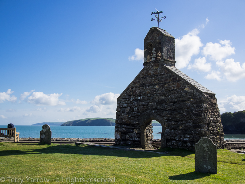 It didn’t take long to reach my first stopping point of the day, Cwm-Yr-Eglwys (the valley of the church), with its ruined church right on the edge of the water.  The church had served the local hamlet and once seated 300 but coastal erosion had been its downfall.  This was such a beautiful spot and I sat for a while just drinking in the warm sunshine and the lovely view across the bay.