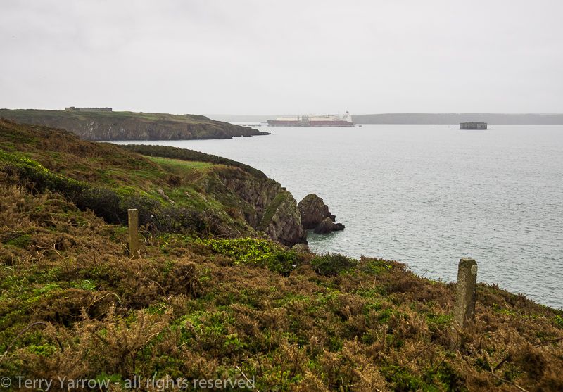 Milford Haven oil tankers come into view, with Stack Rock Fort out at sea