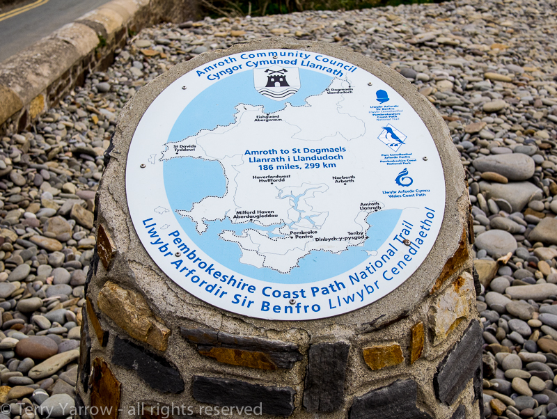 I walked beside the sea wall and just before the road turned inland reached the plaque that marks the southern end of the Pembrokeshire Coast Path – and the end of my walk!  I wasn’t sure what I should feel but after nearly two weeks and 200 miles of walking, the end seemed almost an anticlimax as there was no one there but me.  I took some pictures to record the occasion and was about to cross the road to the pub opposite for some food when a car pulled up and two day walkers got out.  “Are you going to walk the whole trail?”, they asked.  “I just have”, I replied with a smile 🙂 !  I asked them if they would mind taking a picture of me which they gladly did.