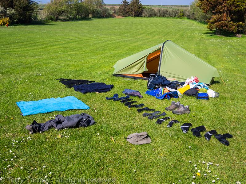 Keeping dry. I had good waterproofs which kept me dry except for my shoes and socks – unfortunately footwear tends not to be completely waterproof unless you wear walking boots and I prefer to walk in approach shoes. This can make it difficult as shoes will not dry overnight in a tent especially on damp nights which means wearing wet shoes again the next day. Ideally you need to carry some light weight shoes for the evenings to avoid having to wear your wet day shoes. Something to remember is that shoes do not only get wet when it rains – invariably the grass was wet either from overnight rain or dew so my shoes got wet very quickly even on dry days.