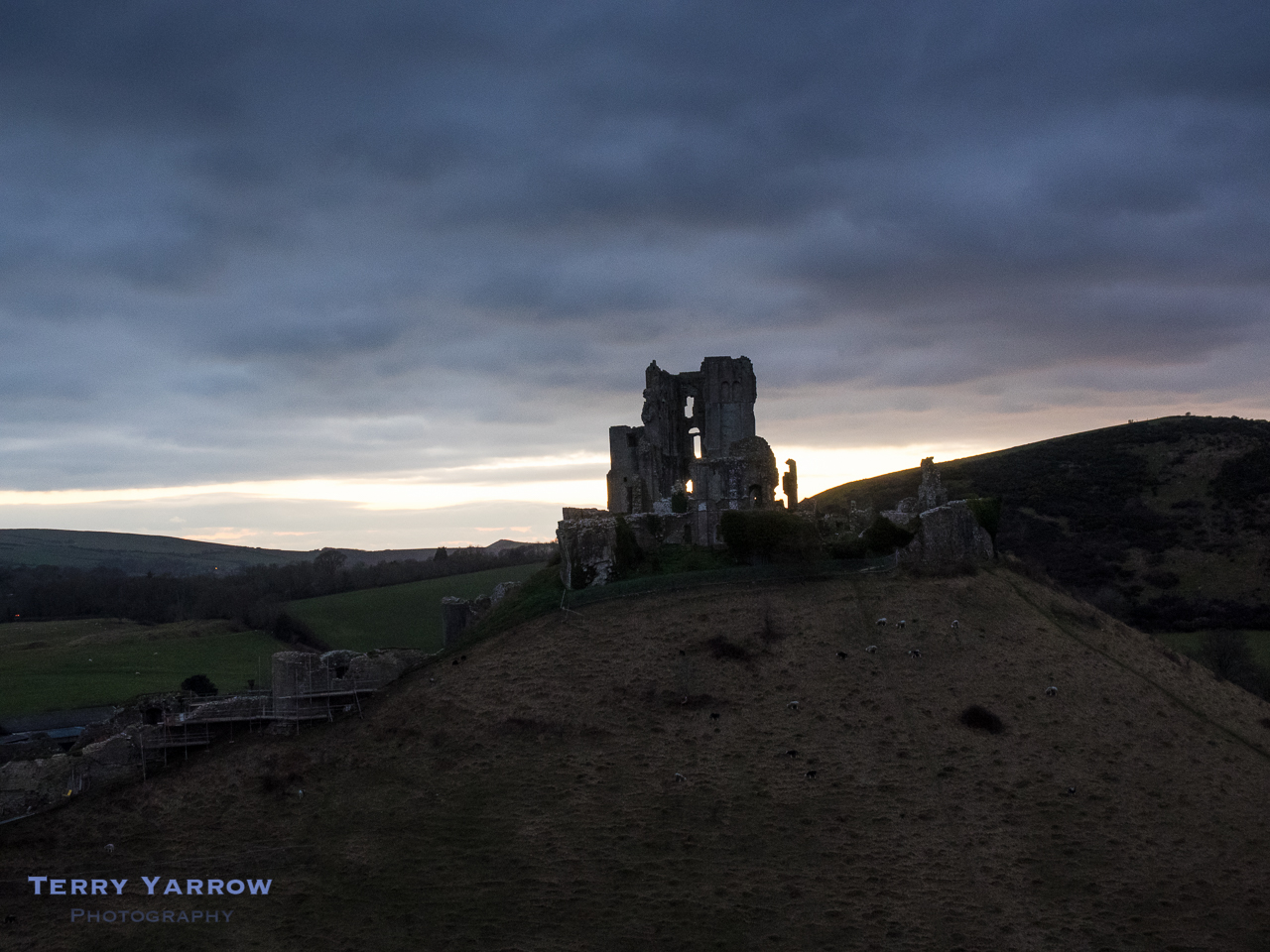 I did a 16 mile walk last week and timed it so that I would reach Corfe Castle in time for the post sunset glow, intending to get some shots of the castle silhouetted against the sky. Now when you are walking that distance, it is not always easy to time your arrival to the minute and I know that as a photographer I should have made sure that I allowed enough time to get there early so that I could get my viewpoint etc right. This is just good photographic practice, especially as sunsets are so fleeting! In reality, I did get there in time, the sun had dropped below the horizon and I was ready for the explosion of light……..except it didn’t materialise as the sun dropped into a bank of very low cloud. I ended up with just a picture of the castle against a bland sky.