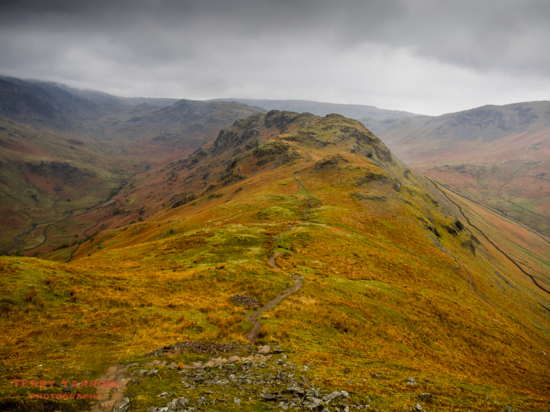 We made our way along the ridge, fighting the wind and rain, stopping for lunch on the way. Eventually we came over the top of Gibson Knott and the view below came into sight. The conditions were grey and dark but the hillside in front had the most wonderful warm colours that seemed to glow through the bad visibility. It was amazing and yet again, despite the pouring rain, the camera came out!