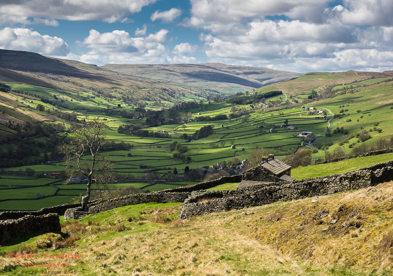 Leaving Gunnerside, the route took us partly up the valley side where we could look down on the valley floor. The pictures below probably sum up this part of the walk with its now broadening and flattening valley, beautiful pattern of fields, barns, dry stone walls and small green pastures.