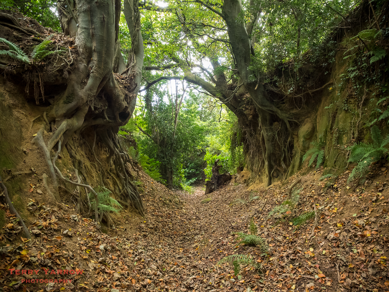 It is of course the network of tree roots that in part holds up the walls of these sunken byways. The trees from which they come were probably planted originally to mark the route and provide some protection from the elements. Over the years original trees have died back and reseeded and now hang precariously on the edge of the rim. Their branches and interlaced foliage high above creates the feeling that when you walk these routes, you are walking underground as if in some giant rabbit warren that weaves in and out of a tangled mesh of roots. They are a mysterious underground world so dark and damp with a feeling of visiting the past so that you could almost expect to see a dinosaur appear at any moment or some other ancient and extinct creature.