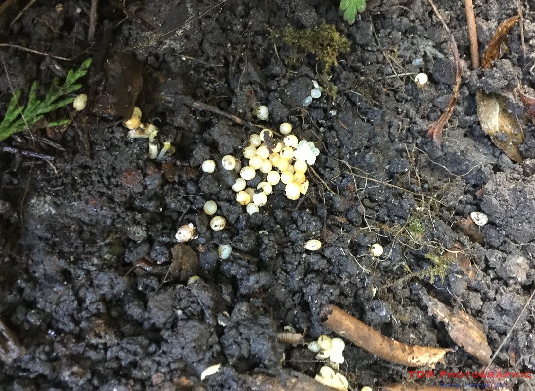 In another part of the garden, I lifted a different tile and underneath were these tiny white eggs. These, I think, are slug or snail eggs. Again, I left them alone as I’m interested to see them hatch πŸ™‚ ! You might wonder why I have old tiles in my garden – well, I put them there deliberately because bugs like to hide under these and it is interesting to lift them occasionally and see what is under there. I have lots of odd things in my garden, such as piles of rotting wood, broken pots, bits of flotsam and jetsam from along the coast etc – it all adds to the interest……for me and the wildlife πŸ™‚ !
