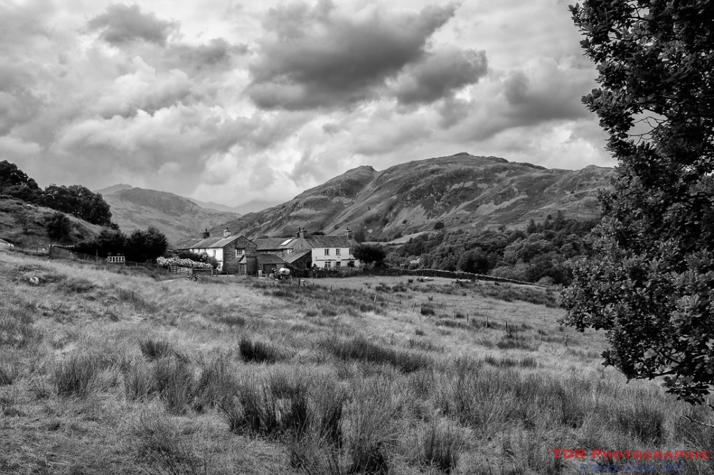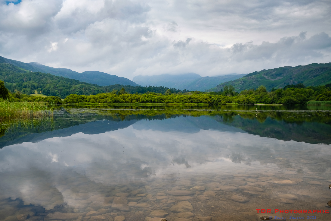 Our first ‘real’ walk was a lower level walk around Elterwater and Little Langdale. We followed Little Langdale Beck, a delightful stream, along a made up path which made for easy walking, until we reached Elterwater itself. The lake bears the name of the village or vice versa, as the village probably took its name from the lake 🙂 ! The lake was so calm and clear and we stopped to take photos of the reflections…….until the rain came and spoiled the pristine mirror like surface. I’d like to say that we got reflections of the Langdale Pikes in the ‘mirror’, but unfortunately they had their heads in the clouds.