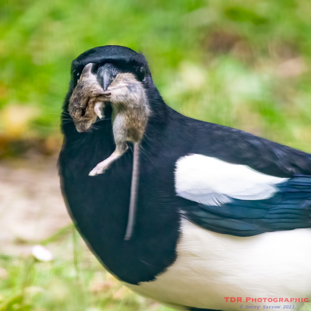 Magpie with meal (taken through the french doors so not as sharp as it might be)