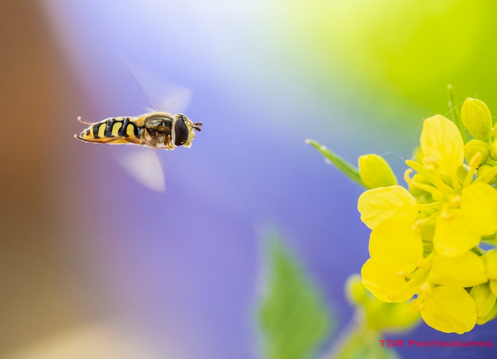 Hoverfly in flight heading for a Wild Mustard plant