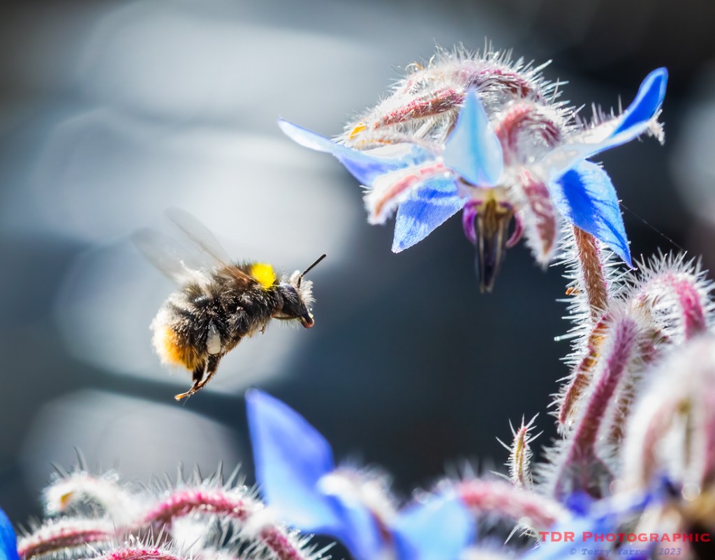 Early Bumblebee in flight, homing in on Common Borage
