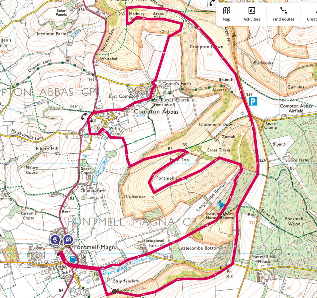 This is a lovely 11 mile circuit that takes in Fontmell Magna, Collyer’s Brook, Fontmell Down, Compton Abbas village and airfield, Melbury Beacon, Compton Down, and much more. With two tea rooms en route (check opening times), amazing views and some wonderful hilltop walking, it is well worth the effort of climbing the hills. It would probably be regarded as a fairly strenuous route but don’t let that put you off. There is a video of this route here.
