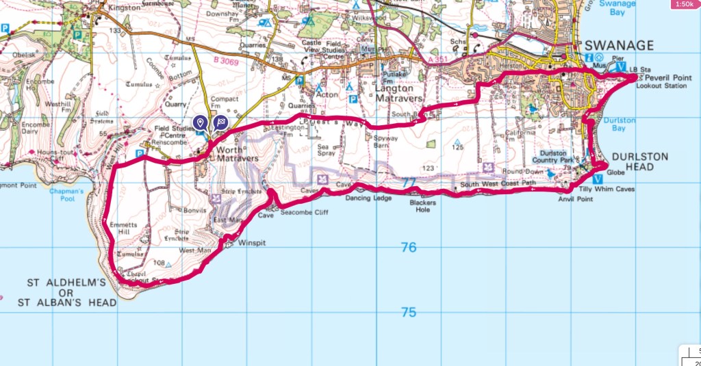 This is an amazing long distance route around the Isle of Purbeck, countryside and coast, starting in Worth Matravers, following the Priest’s Way to Swanage, then along the coast around Durlston Head, passing the coastal quarries before climbing up St Aldhelm’s Head and Emmett’s Hill to return to Worth. It is a challenging 15+ mile circuit but rewards the effort, with amazing views all the way.