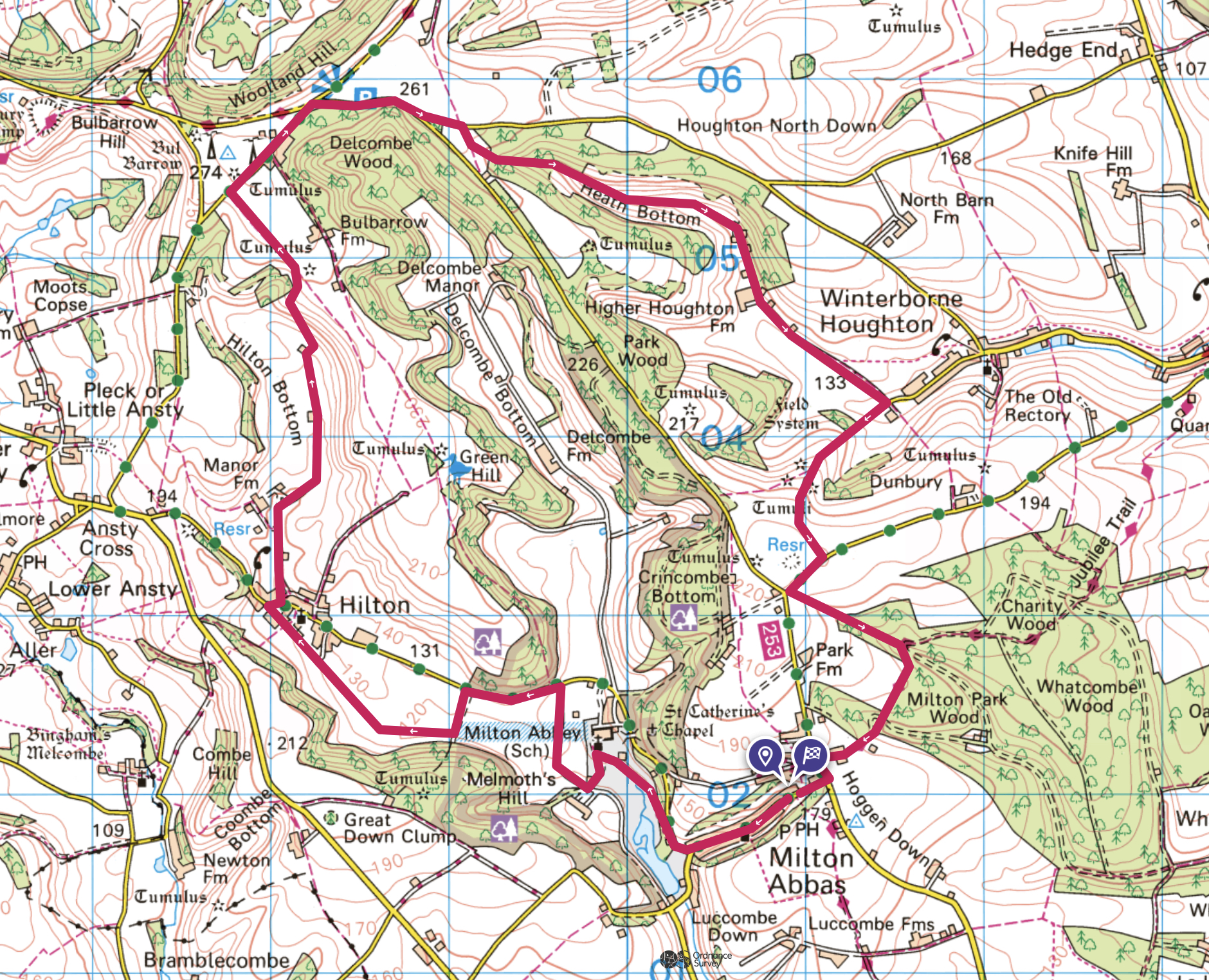 This lovely 9.5 mile circuit starts at the picture postcard village of Milton Abbas and takes in Milton Abbey, the delightful village of Hilton, the viewpoint of Bulbarrow Hill, and a lovely mix of countryside and woodland. Parking and start/finish in Milton Abbas and refreshments available at the Hambro Arms, Milton Abbas.